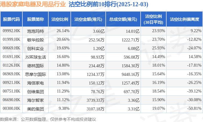 从沽空比例来看,泡泡玛特、敏华控股、创科实业沽空比例位居行业前三,分别为26.14%、20.66%、19.69%。