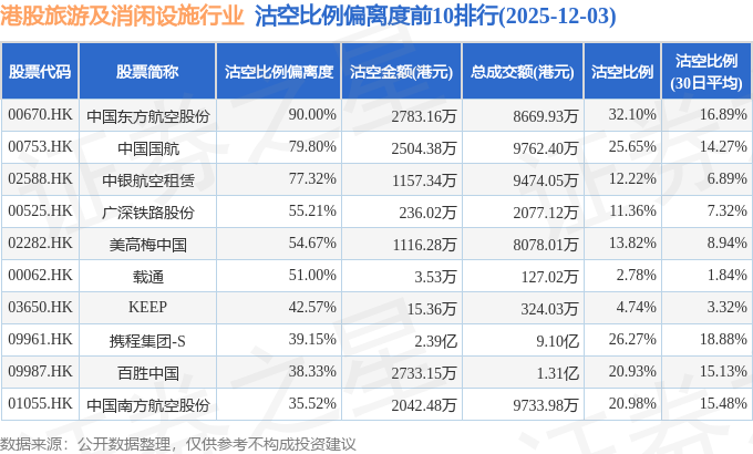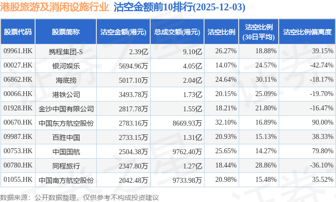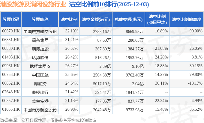 证券之星消息,12月3日港交所披露数据显示,当日港股旅游及消闲设施行业的134只个股中有35只被沽空,总沽空股数为3196.49万股,总沽空金额为6.14亿元(港元),而当日旅游及消闲设施行业的总成交金额为31.76亿元(港元),沽空比例为19.34%。当日旅游及消闲设施行业总体跌0.55%。