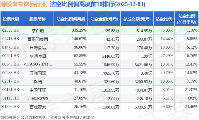 从沽空比例偏离度来看,茶百道、百果园集团、日清食品沽空比例偏离度位居行业前三,分别为335.25%、146.67%、96.06%。