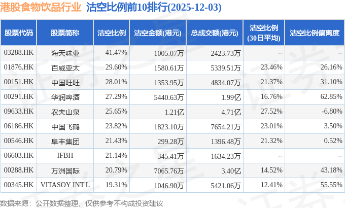 从沽空金额来看,农夫山泉、万洲国际、华润啤酒沽空金额位居行业前三,分别为1.21亿港元、7065.76万港元、5440.63万港元。