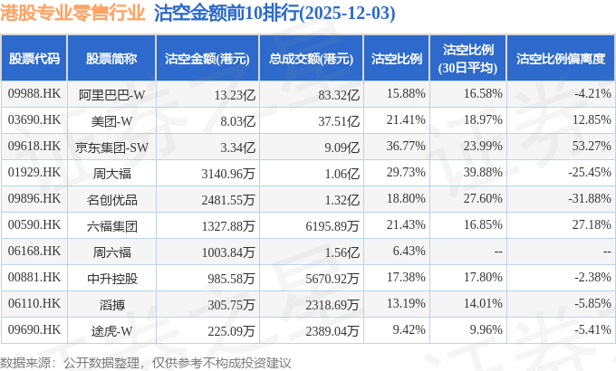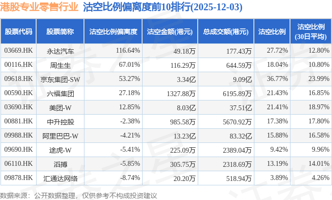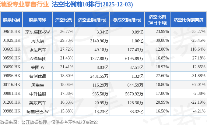 从沽空比例来看,京东集团-SW、周大福、永达汽车沽空比例位居行业前三,分别为36.77%、29.73%、27.72%。
