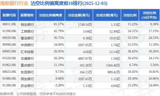 从沽空比例偏离度来看,恒生银行、工商银行、建设银行沽空比例偏离度位居行业前三,分别为81.57%、41.79%、36.75%。