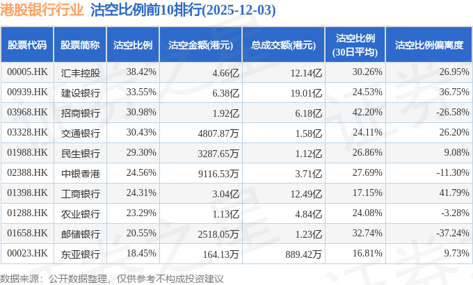 从沽空比例来看,汇丰控股、建设银行、招商银行沽空比例位居行业前三,分别为38.42%、33.55%、30.98%。
