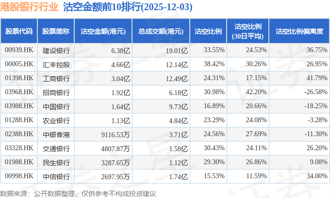 从沽空金额来看,建设银行、汇丰控股、工商银行沽空金额位居行业前三,分别为6.38亿港元、4.66亿港元、3.04亿港元。