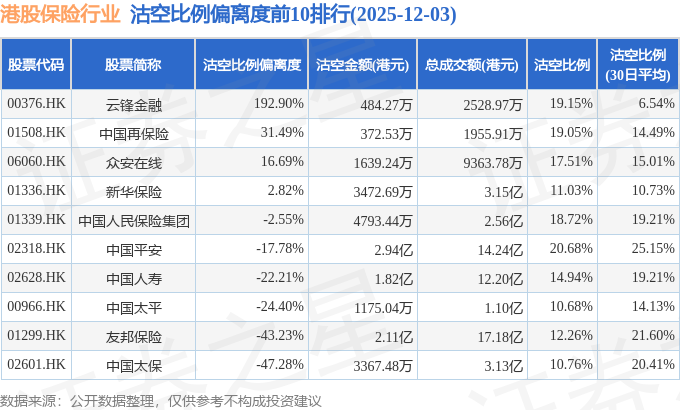证券之星消息,12月3日港交所披露数据显示,当日港股保险行业的21只个股中有16只被沽空,总沽空股数为3375.13万股,总沽空金额为9.19亿元(港元),而当日保险行业的总成交金额为64.25亿元(港元),沽空比例为14.3%。当日保险行业总体跌1.45%。