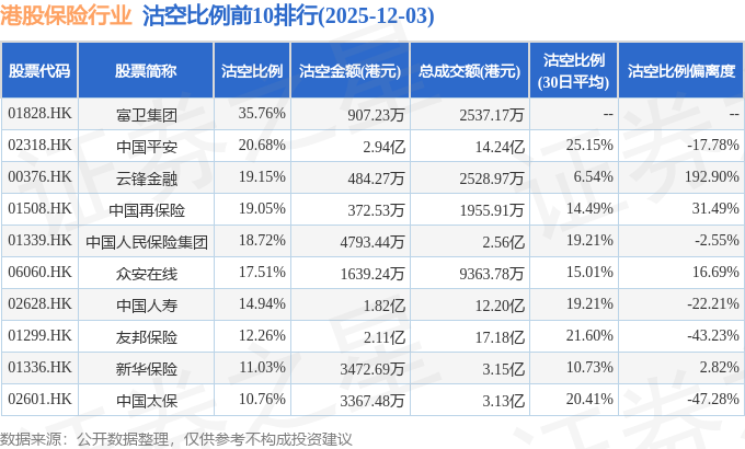 从沽空比例来看,富卫集团、中国平安、云锋金融沽空比例位居行业前三,分别为35.76%、20.68%、19.15%。