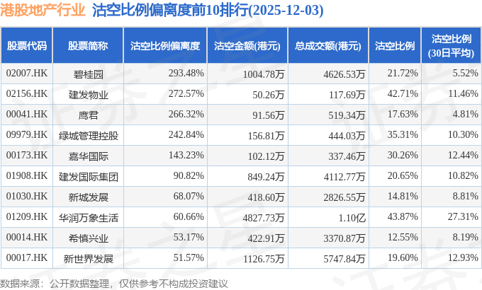 从沽空比例偏离度来看,碧桂园、建发物业、鹰君沽空比例偏离度位居行业前三,分别为293.48%、272.57%、266.32%。