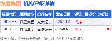 截至2025年12月3日收盘,微盟集团(02013.HK)报收于1.88港元,下跌3.09%,成交量6969.8万股,成交额1.31亿港元。投行对该股的评级以增持为主,近90天内共有1家投行给出增持评级,近90天的目标均价为3港元。光大证券最新一份研报给予微盟集团增持评级。