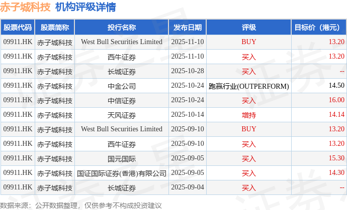 截至2025年12月3日收盘,赤子城科技(09911.HK)报收于9.09港元,下跌2.57%,成交量235.0万股,成交额2142.88万港元。投行对该股的评级以买入为主,近90天内共有7家投行给出买入评级,近90天的目标均价为14.12港元。West Bull Securities Limited最新一份研报给予赤子城科技BUY评级,目标价13.2港元。
