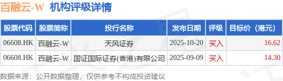 截至2025年12月3日收盘,百融云-W(06608.HK)报收于9.55港元,下跌0.52%,成交量224.05万股,成交额2144.51万港元。投行对该股的评级以买入为主,近90天内共有2家投行给出买入评级,近90天的目标均价为15.46港元。天风证券最新一份研报给予百融云-W买入评级,目标价16.62港元。