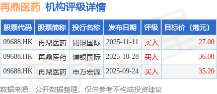 截至2025年12月3日收盘,再鼎医药(09688.HK)报收于15.18港元,下跌0.72%,成交量682.21万股,成交额1.04亿港元。投行对该股的评级以买入为主,近90天内共有3家投行给出买入评级,近90天的目标均价为32.73港元。浦银国际最新一份研报给予再鼎医药买入评级,目标价27港元。