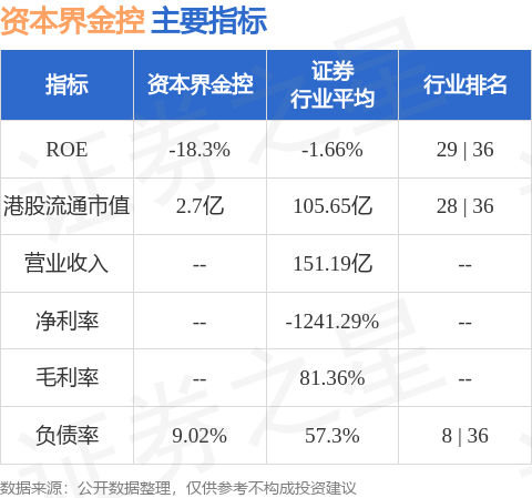 资本界金控港股市值2.7亿港元,在证券行业中排名第28。主要指标见下表: