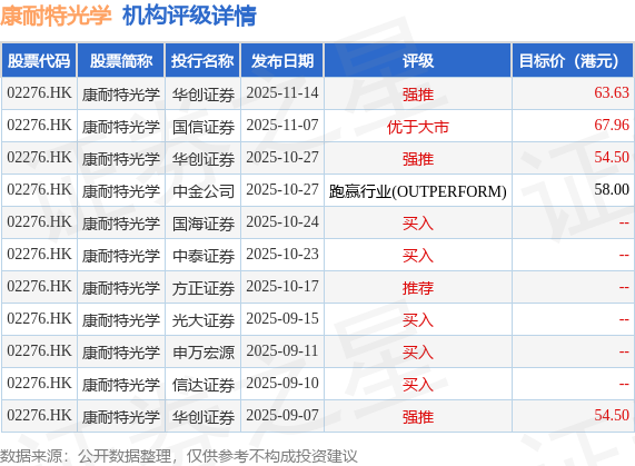 投行对该股的评级以买入为主,近90天内共有5家投行给出买入评级,近90天的目标均价为59.72港元。华创证券最新一份研报给予康耐特光学强推评级,目标价63.63港元。