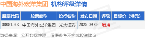 截至2025年12月4日收盘,中国海外宏洋集团(00081.HK)报收于2.33港元,下跌0.43%,成交量125.8万股,成交额294.41万港元。投行对该股的评级以增持为主,近90天内共有1家投行给出增持评级。光大证券最新一份研报给予中国海外宏洋集团增持评级。