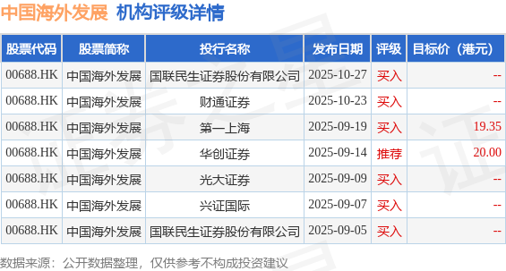 截至2025年12月4日收盘,中国海外发展(00688.HK)报收于13.14港元,上涨0.46%,成交量1009.67万股,成交额1.32亿港元。投行对该股的评级以买入为主,近90天内共有6家投行给出买入评级,近90天的目标均价为19.68港元。国联民生证券股份有限公司最新一份研报给予中国海外发展买入评级。