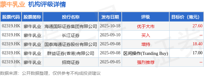 截至2025年12月4日收盘,蒙牛乳业(02319.HK)报收于14.77港元,与上一交易日持平,成交量857.95万股,成交额1.27亿港元。投行对该股的评级以强烈推荐为主,近90天内共有1家投行给出强烈推荐评级,近90天的目标均价为21港元。海通国际证券集团有限公司最新一份研报给予蒙牛乳业优于大市评级,目标价27.6港元。