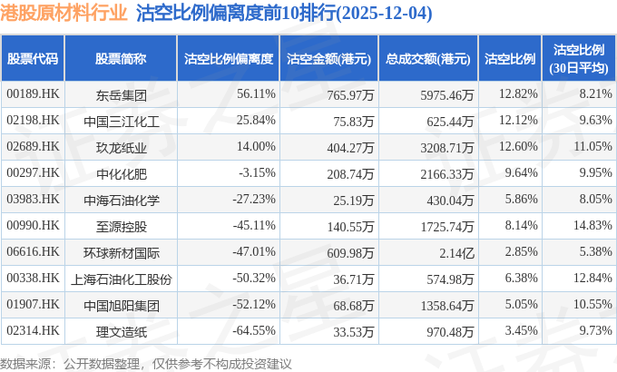 从沽空金额来看,东岳集团、环球新材国际、玖龙纸业沽空金额位居行业前三,分别为765.97万港元、609.98万港元、404.27万港元。