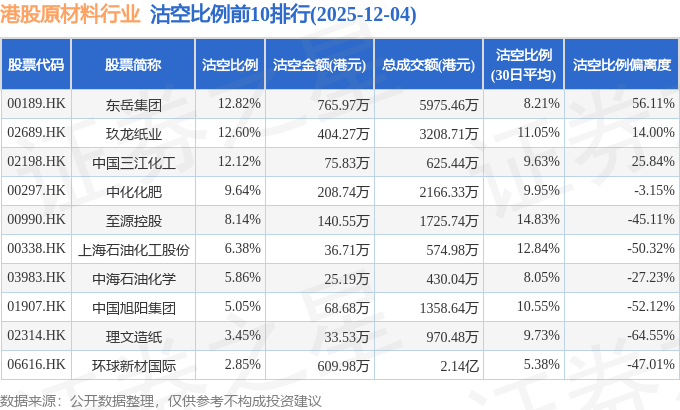 从沽空比例来看,东岳集团、玖龙纸业、中国三江化工沽空比例位居行业前三,分别为12.82%、12.6%、12.12%。