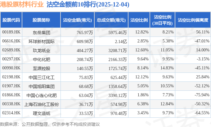 证券之星消息,12月4日港交所披露数据显示,当日港股原材料行业的56只个股中有11只被沽空,总沽空股数为644.4万股,总沽空金额为2432.48万元(港元),而当日原材料行业的总成交金额为4.46亿元(港元),沽空比例为5.46%。当日原材料行业总体跌0.38%。