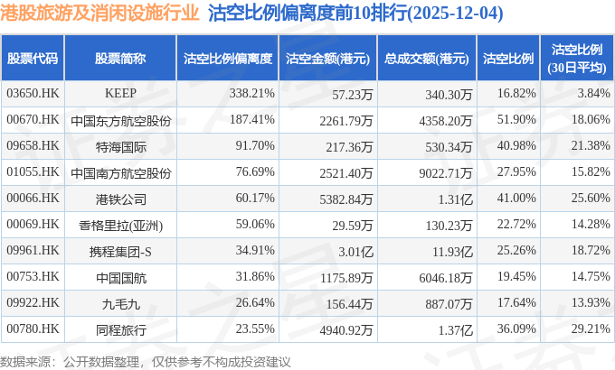 从沽空比例偏离度来看,KEEP、中国东方航空股份、特海国际沽空比例偏离度位居行业前三,分别为338.21%、187.41%、91.7%。