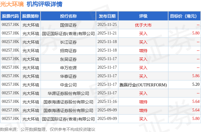 截至2025年12月4日收盘,光大环境(00257.HK)报收于5.0港元,上涨0.4%,成交量620.0万股,成交额3090.7万港元。投行对该股的评级以买入为主,近90天内共有7家投行给出买入评级,近90天的目标均价为5.66港元。国信证券最新一份研报给予光大环境优于大市评级。
