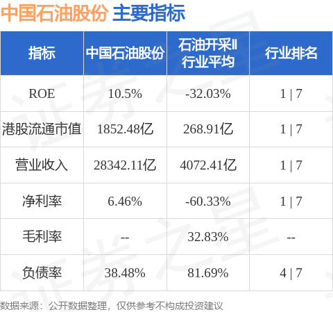 中国石油股份港股市值1852.48亿港元,在石油开采Ⅱ行业中排名第1。主要指标见下表: