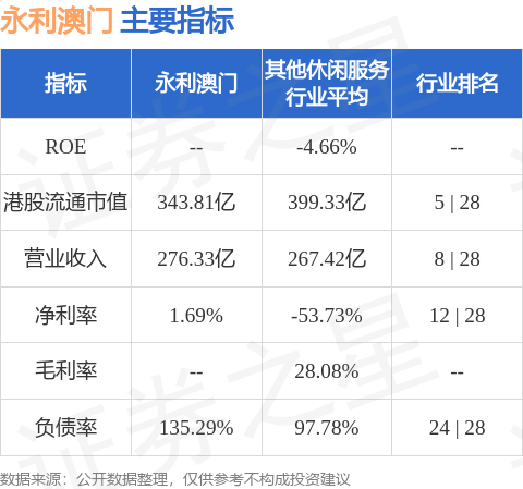 永利澳门港股市值343.81亿港元,在其他休闲服务行业中排名第5。主要指标见下表: