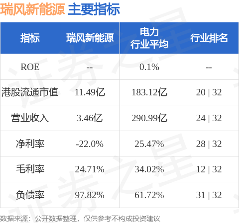 瑞风新能源港股市值11.49亿港元,在电力行业中排名第20。主要指标见下表: