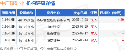 投行对该股的评级以买入为主,近90天内共有4家投行给出买入评级,近90天的目标均价为4.29港元。环球富盛理财有限公司最新一份研报给予中广核矿业买入评级,目标价4.29港元。