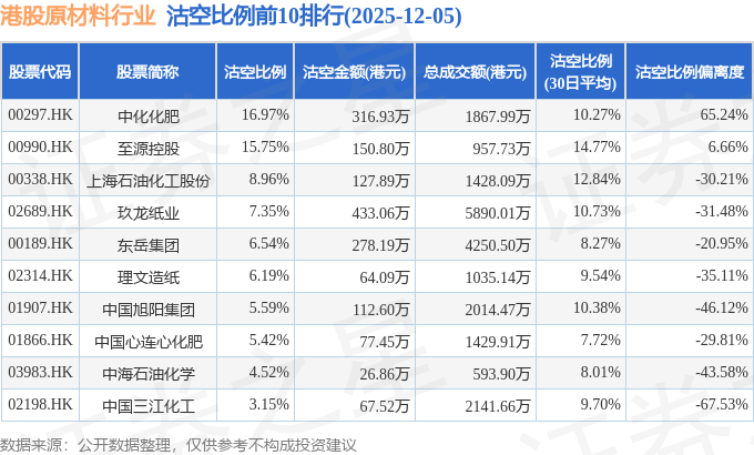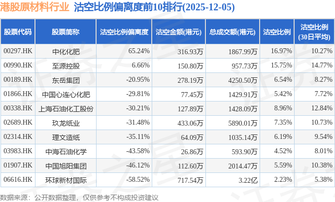 从沽空比例偏离度来看,中化化肥、至源控股、东岳集团沽空比例偏离度位居行业前三,分别为65.24%、6.66%、-20.95%。