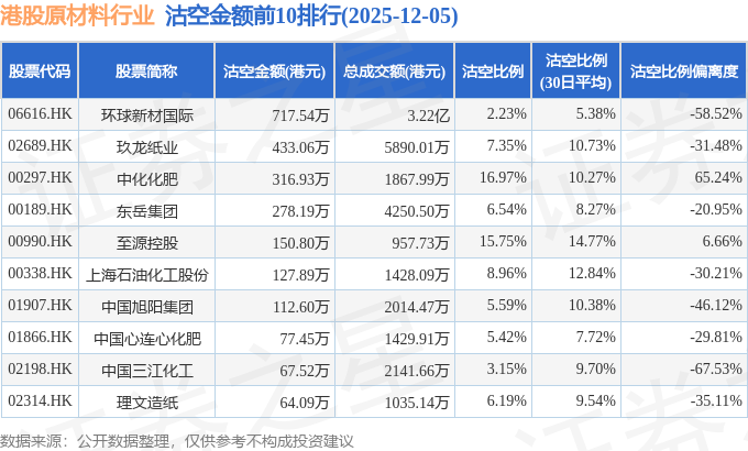 从沽空金额来看,环球新材国际、玖龙纸业、中化化肥沽空金额位居行业前三,分别为717.54万港元、433.06万港元、316.93万港元。