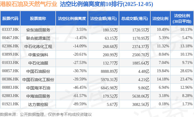 从沽空比例偏离度来看,安东油田服务、联合能源集团、中石化炼化工程沽空比例偏离度位居行业前三,分别为3.55%、-1.45%、-14.09%。