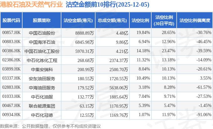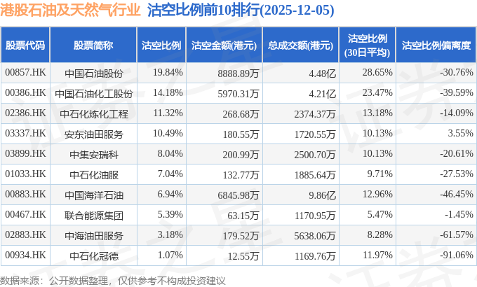 从沽空金额来看,中国石油股份、中国海洋石油、中国石油化工股份沽空金额位居行业前三,分别为8888.89万港元、6845.98万港元、5970.31万港元。