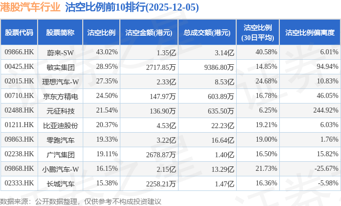 从沽空比例来看,蔚来-SW、敏实集团、理想汽车-W沽空比例位居行业前三,分别为43.02%、28.95%、27.35%。