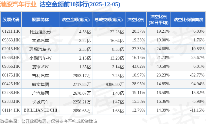 从沽空金额来看,比亚迪股份、零跑汽车、理想汽车-W沽空金额位居行业前三,分别为4.53亿港元、3.22亿港元、2.33亿港元。
