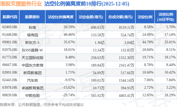 从沽空金额来看,新东方-S、粉笔、中教控股沽空金额位居行业前三,分别为1.36亿港元、696.63万港元、565.92万港元。