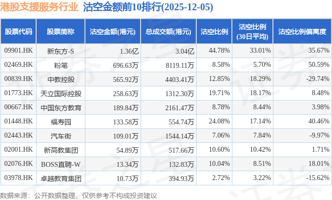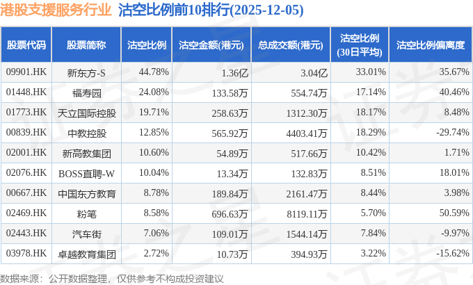 从沽空比例来看,新东方-S、福寿园、天立国际控股沽空比例位居行业前三,分别为44.78%、24.08%、19.71%。