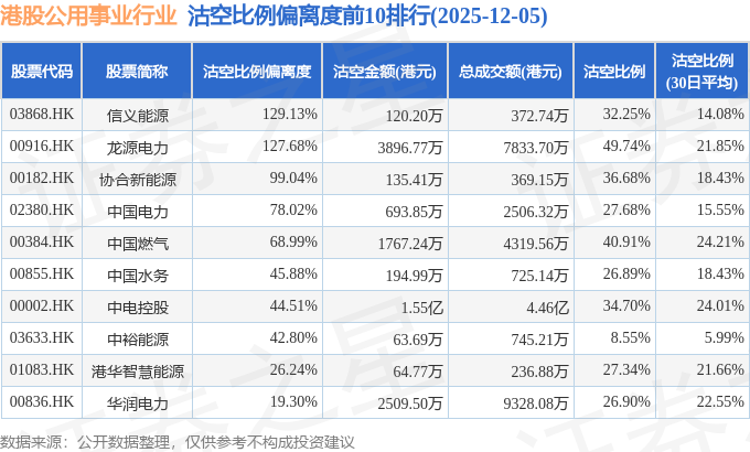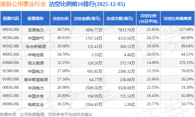 从沽空金额来看,中电控股、香港中华煤气、龙源电力沽空金额位居行业前三,分别为1.55亿港元、4428.38万港元、3896.77万港元。