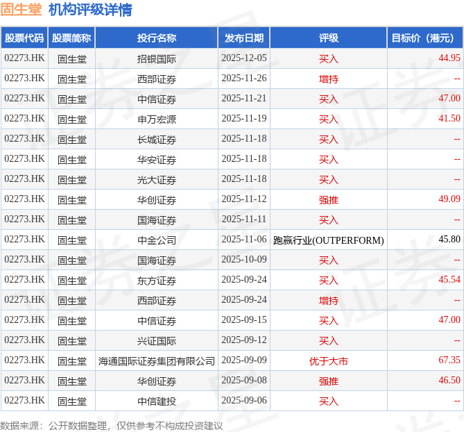截至2025年12月5日收盘,固生堂(02273.HK)报收于28.46港元,下跌0.63%,成交量103.78万股,成交额2944.31万港元。投行对该股的评级以买入为主,近90天内共有12家投行给出买入评级,近90天的目标均价为48.3港元。招银国际最新一份研报给予固生堂买入评级,目标价44.95港元。