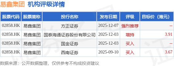 投行对该股的评级以买入为主,近90天内共有2家投行给出买入评级,近90天的目标均价为3.79港元。方正证券最新一份研报给予易鑫集团强烈推荐评级。