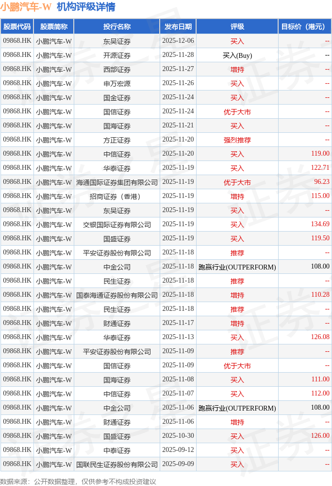投行对该股的评级以买入为主,近90天内共有15家投行给出买入评级,近90天的目标均价为116.04港元。东吴证券最新一份研报给予小鹏汽车-W买入评级。