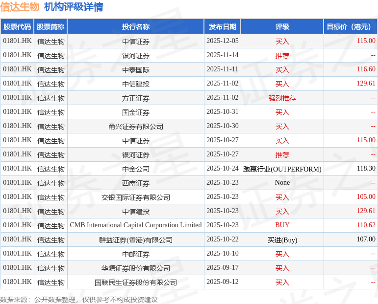 投行对该股的评级以买入为主,近90天内共有11家投行给出买入评级,近90天的目标均价为116.3港元。中信证券最新一份研报给予信达生物买入评级,目标价115港元。