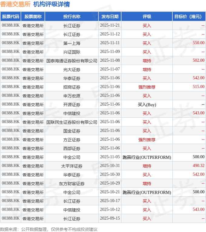 投行对该股的评级以买入为主,近90天内共有14家投行给出买入评级,近90天的目标均价为522.73港元。长江证券最新一份研报给予香港交易所买入评级。