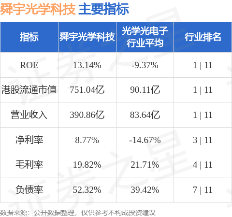 舜宇光学科技港股市值751.04亿港元,在光学光电子行业中排名第1。主要指标见下表:
