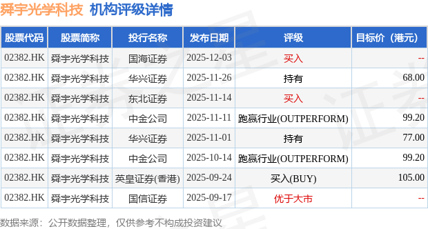 截至2025年12月8日收盘,舜宇光学科技(02382.HK)报收于68.55港元,下跌0.07%,成交量577.82万股,成交额3.98亿港元。投行对该股的评级以跑赢行业(OUTPERFORM)为主,近90天内共有2家投行给出跑赢行业(OUTPERFORM)评级,近90天的目标均价为89.68港元。国海证券最新一份研报给予舜宇光学科技买入评级。