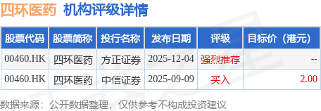 截至2025年12月8日收盘,四环医药(00460.HK)报收于1.32港元,下跌0.75%,成交量1516.75万股,成交额1998.62万港元。投行对该股的评级以强烈推荐为主,近90天内共有1家投行给出强烈推荐评级,近90天的目标均价为2港元。方正证券最新一份研报给予四环医药强烈推荐评级。