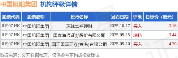 截至2025年12月8日收盘,中国旭阳集团(01907.HK)报收于2.25港元,下跌1.32%,成交量823.0万股,成交额1831.02万港元。投行对该股的评级以买入为主,近90天内共有2家投行给出买入评级,近90天的目标均价为3.6港元。环球富盛理财最新一份研报给予中国旭阳集团买入评级,目标价3.16港元。