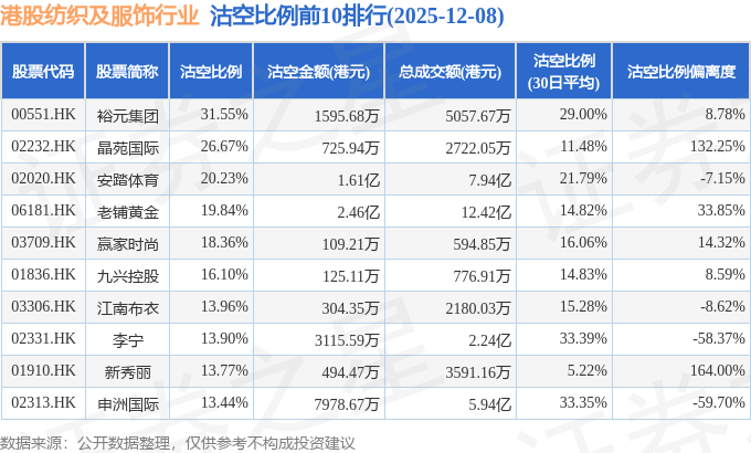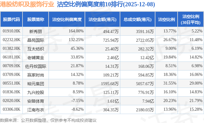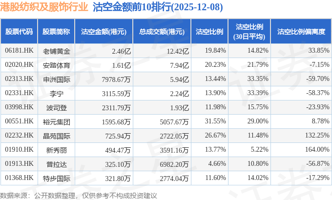 从沽空金额来看,老铺黄金、安踏体育、申洲国际沽空金额位居行业前三,分别为2.46亿港元、1.61亿港元、7978.67万港元。