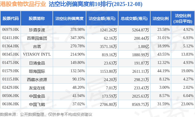 从沽空比例偏离度来看,珍酒李渡、百果园集团、古茗沽空比例偏离度位居行业前三,分别为378.98%、347.3%、270.78%。