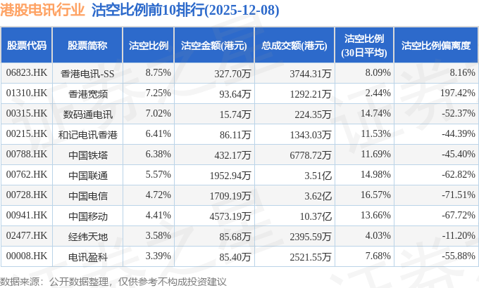 从沽空比例来看,香港电讯-SS、香港宽频、数码通电讯沽空比例位居行业前三,分别为8.75%、7.25%、7.02%。